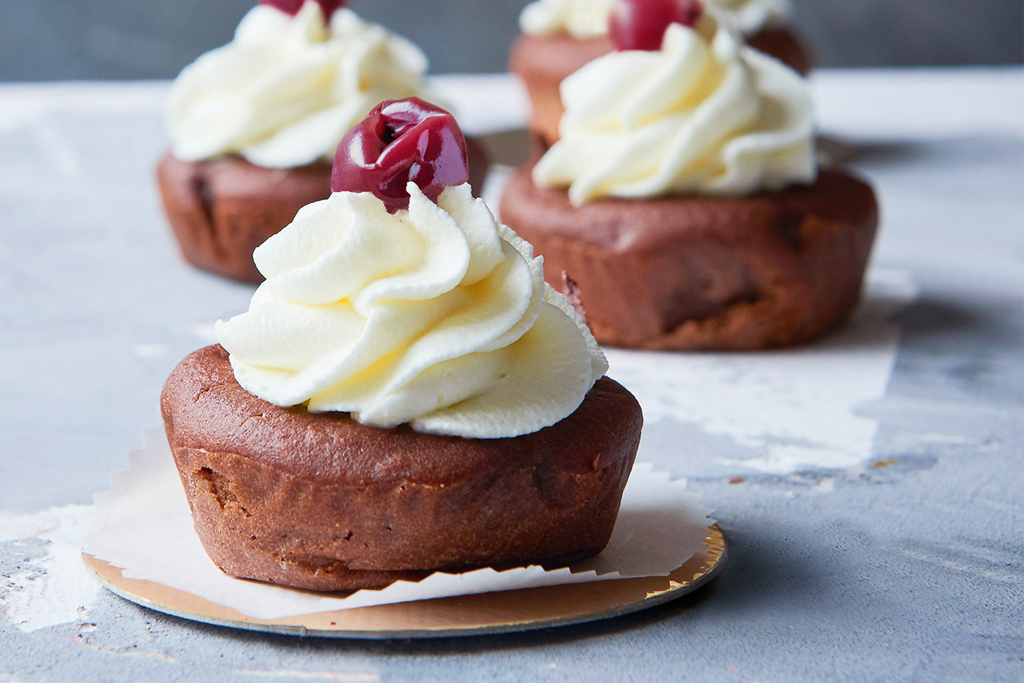 Den Ofen auf 180°C Ober- und Unterhitze vorheizen. Die Mulden eines Cupcake-Backblechs mit Öl auspinseln. Beide Mehle mit Backpulver und Kakao vermischen.